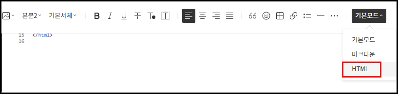 해당 코드를 복사한 후에 블로그 글을 작성하는 페이지에서 기본모드 -> HTML 로 변경합니다.