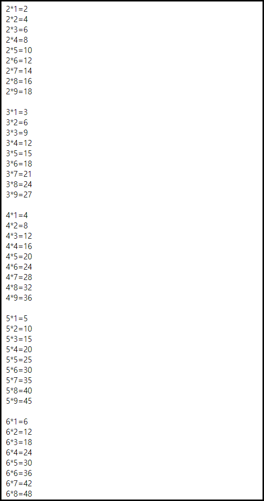 동일한 방법으로 구구단을 출력해보겠습니다.