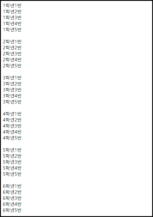 아래 예제는 1~6학년을 출력하고 각 학년마다 5반까지 출력하도록 했습니다.