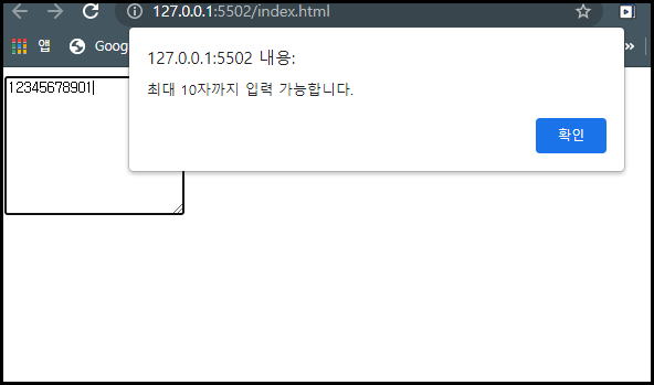 jQuery로 id값을 불러와 textarea의 length(글자 수)가 10이 넘어가게 되면 alert(알림)창을 띄우고