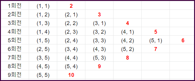 회전 마다 주소값의 행과 열을 더한 값이 같은 걸 볼 수 있습니다.