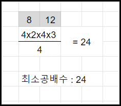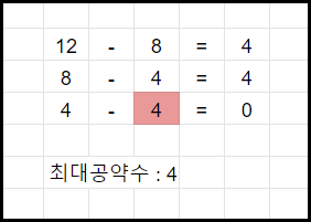 최대공약수를 구하는 방법으로 구하려는 두 수를 비교해서 큰 수에서 작은 수를 0이 나올 때까지 빼나갑니다.