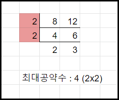 나눈 값을 모두 곱하면 최대공약수가 나옵니다.