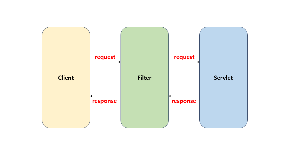 - 클라이언트가 요청을 보내면, 필터는 doFilter() 메서드를 통해 요청을 처리하고, 필요한 경우 FilterChain을 사용해 요청을 서블릿으로 넘기거나, 응답을 수정하여 클라이언트에게 전달할 수 있습니다.